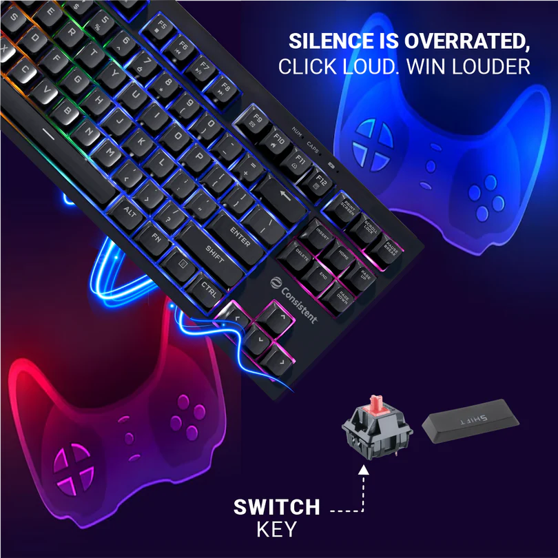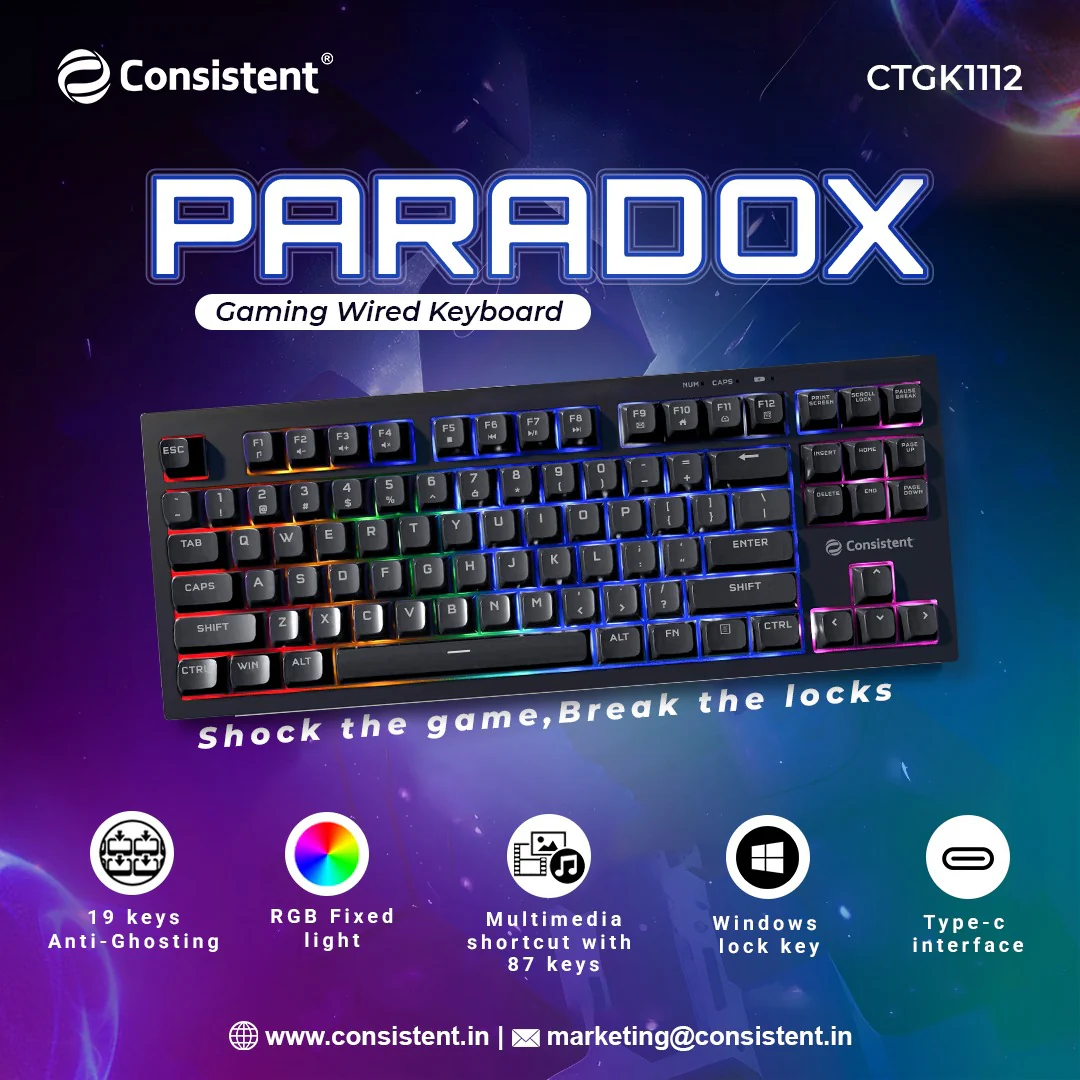 Consistent PARADOX Gaming Wired & Mac Support Keyboard, USB Plug-and-Play, Keystrokes, Rainbow Breath Light, 1.5 Cable Length.